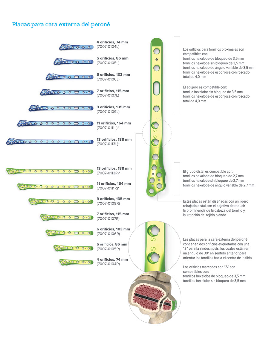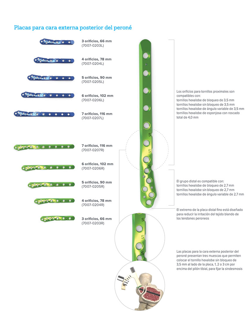Las placas para la cara externa del peroné, las placas para la cara externa posterior del peroné, las placas para la cara interna posterior de la parte distal de la tibia, las placas para la cara externa posterior de la parte distal de la tibia y las placas antideslizamiento para la cara interna están concebidas para la fijación de fracturas, osteotomías y pseudoartrosis de la parte distal de la tibia y el peroné, sobre todo en huesos osteopénicos.