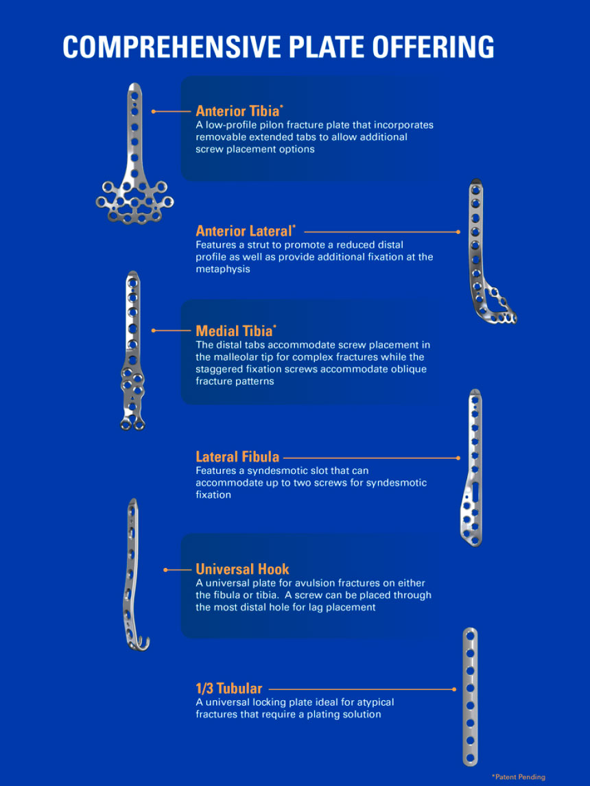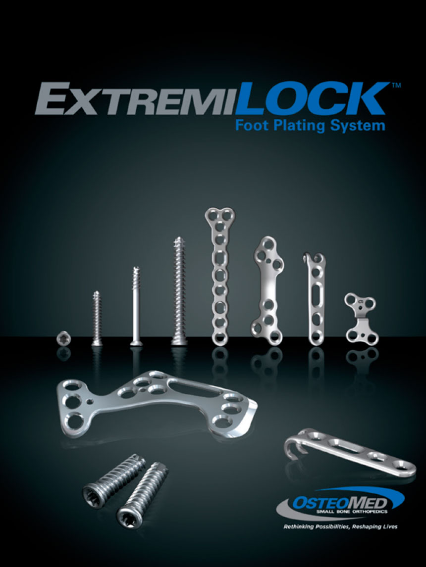 ExtremiLOCK de OsteoMed es un sistema integral de fractura de tobillo destinado a brindar soluciones para fracturas simples a complejas de la tibia distal y el peroné. El sistema es uno de los primeros en presentar tecnología de tornillo de doble avance en opciones de tornillos canulados, no bloqueados y con bloqueo. Todos los componentes del sistema están contenidos en una bandeja de un solo instrumento, que alberga seis opciones de placas para fracturas, siete opciones de fijación de tornillos e instrumentación completa codificada por colores para facilitar su uso.